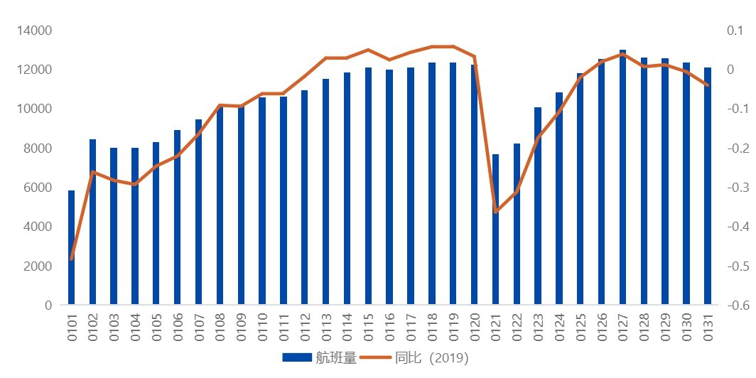 1月国内航线日均航班量恢复至2019年九成水平