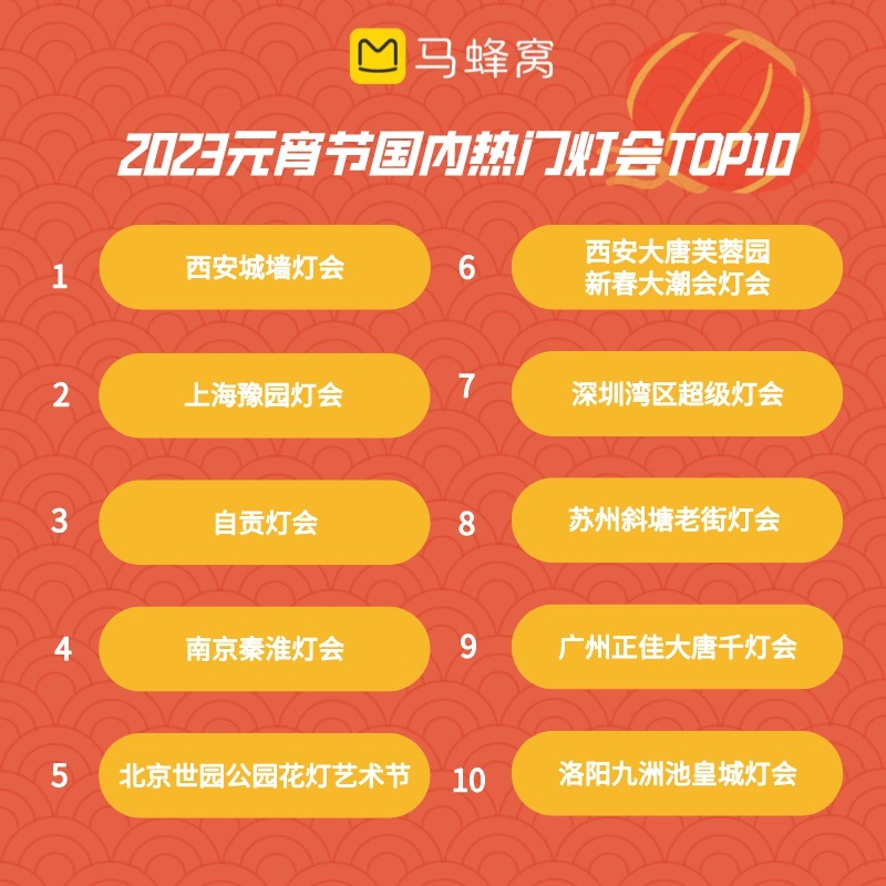 在灯会带动下,“夜游”成为各地元宵节关键词,平均热度上涨超60%。春节期间吸引了无数游客的西安城墙灯会热度高涨133%,荣登元宵节十大热门灯会榜首;“山海经”主题的豫园灯会位居次席,也是沪上元宵赏灯届的“顶流”;自贡灯会同样热度不减,是川渝地区元宵周边游的主要目的地。