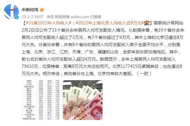 国家统计局网站2月2日日公布了31个省份去年居民人均可支配收入情况。从数据来看,有19个省份去年居民人均可支配收入超过了3万元,有7个省份超过了4万元,其中上海和北京已逼近8万元大关。分省份来看,共有8个省份的居民人均可支配收入高于全国平均水平,分别是上海、北京、浙江、江苏、天津、广东、福建和山东,全部来自东部沿海地区。其中,前七名的省份人均可支配收入超过4万元。数据显示,去年上海居民人均可支配收入79610元,位居榜首,距离8万元大关近在咫尺。北京以77415元紧随其后,也在逼近8万元大关。相对来说,其他省份与上海、北京均有较大差距。