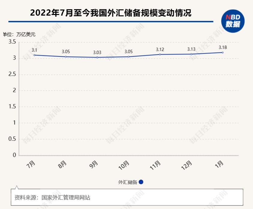 2月7日,国家外汇管理局发布数据显示,截至2023年1月末,我国外汇储备规模为3.18万亿美元,较2022年12月上升568亿美元,升幅为1.82%。