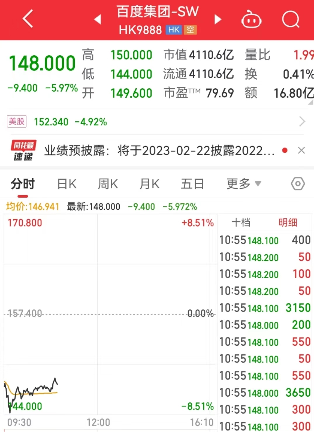 盘面上,截至发稿,港股百度下跌5.97%,报148港元/股,总市值4110.6亿港元。