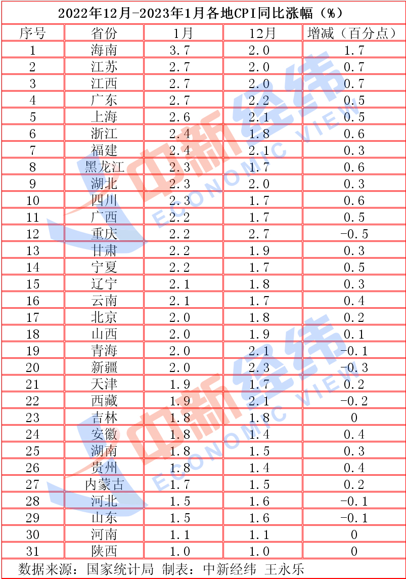 中新经纬2月15日电 (王永乐)日前,国家统计局公布了31省份2023年1月居民消费价格指数(CPI)。中新经纬梳理发现,1月,22省份CPI同比涨幅高于上月。其中,海南最高为涨3.7%,陕西最低涨1.0%。