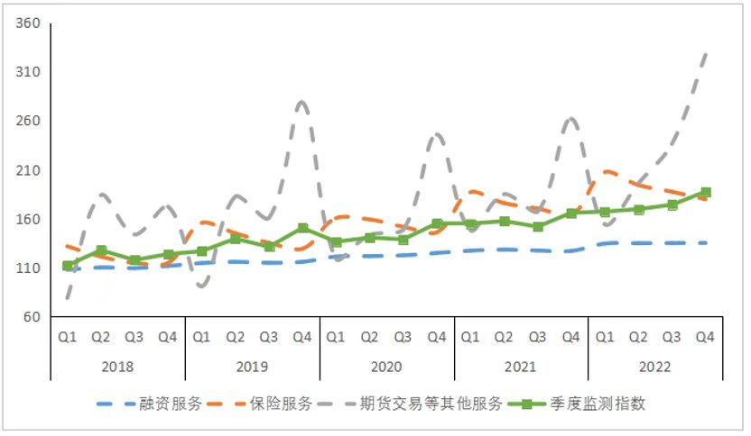 季度监测指数通过融资服务、保险服务、期货交易等其他服务三方面,及时反映金融服务乡村振兴的发展情况。可以看到,近五年间,金融服务乡村振兴质效呈现波动上升态势。2022年以来,季度监测指数保持高位运行,这与金融机构加大融资服务、保险服务支持力度,农产品期货等创新服务的快速发展有关。