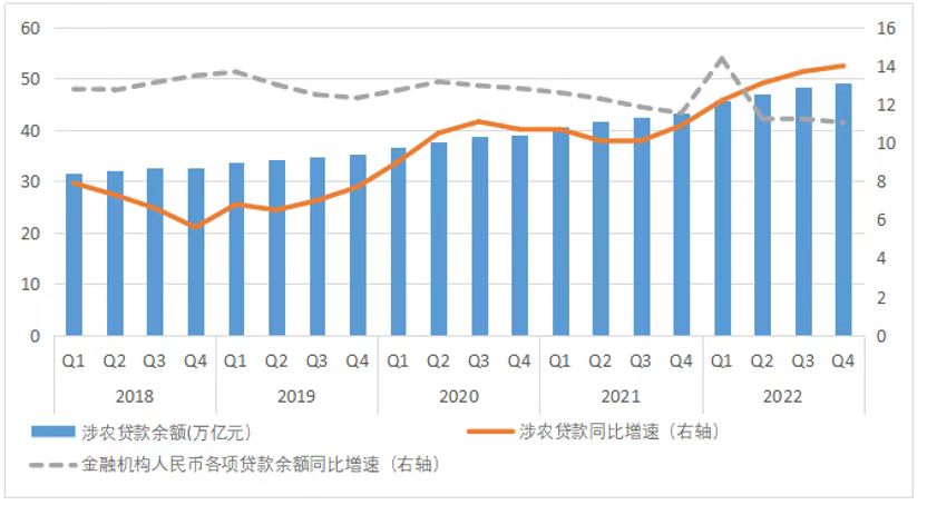 金融服务乡村振兴季度监测指数显示,2022年四季度指数值增长至187.34点。2022年末,本外币涉农贷款余额达49.25万亿元,同比增长14%,创下近年新高。