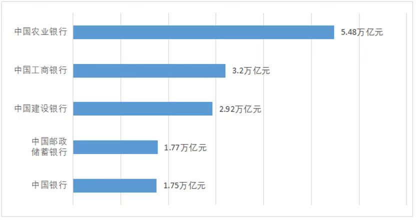 从金融机构来看,截至2022年三季度,五家国有大行涉农贷款余额总计15.1亿元,约占全部涉农贷款余额的31%,为助力乡村振兴贡献主要力量。其中,中国农业银行最高,达到5.48万亿元。