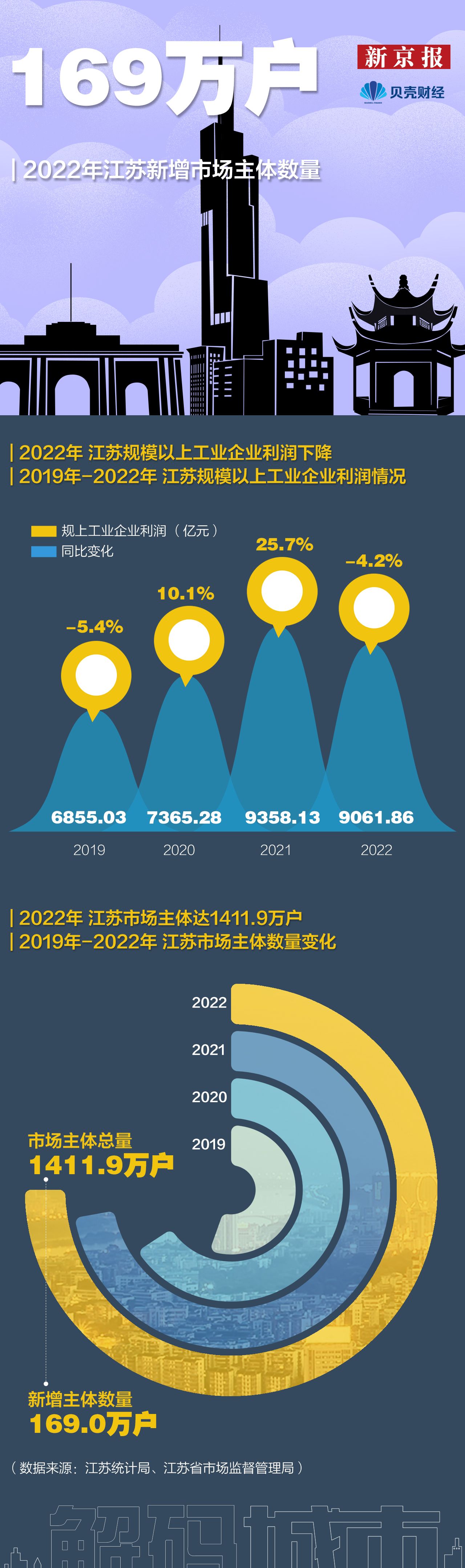江苏2022年市场主体总量增加至1411.9万户,相比2017年增加74.3%,总量居全国第二。2020年,江苏新增市场主体267.6万户;2022年新增169.0万户。江苏2023年政府工作报告提出,2023年将加大对市场主体支持力度,持续推动国家和本省各项惠企政策落实到位,针对困难行业、企业特别是中小企业和个体工商户所需所盼。