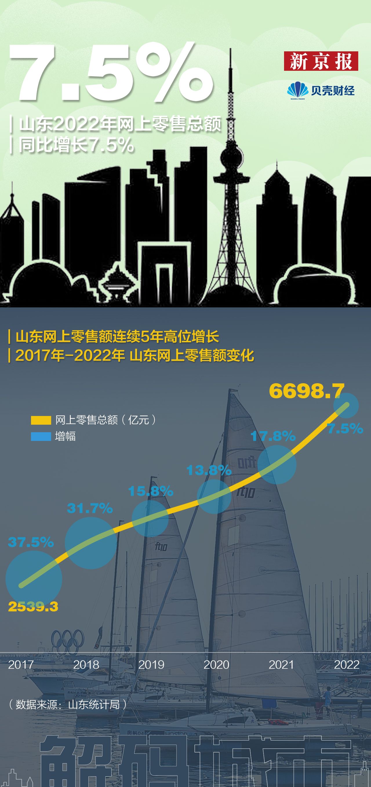 2022年山东消费增长乏力,社会消费品零售同比下降1.4%,但网上零售正向增长,成为山东消费新的增长动能。2017年-2021年,山东网上零售消费高位增长,2022年网上零售总额达6698.7亿元,同比增长7.5%,电商逐渐成为消费增长的重要动力。