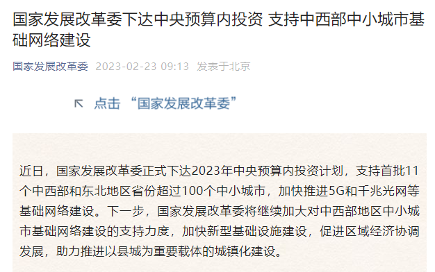 中国网财经2月23日讯 据国家发展改革委微信公众号消息,近日,国家发展改革委正式下达2023年中央预算内投资计划,支持首批11个中西部和东北地区省份超过100个中小城市,加快推进5G和千兆光网等基础网络建设。下一步,国家发展改革委将继续加大对中西部地区中小城市基础网络建设的支持力度,加快新型基础设施建设,促进区域经济协调发展,助力推进以县城为重要载体的城镇化建设。