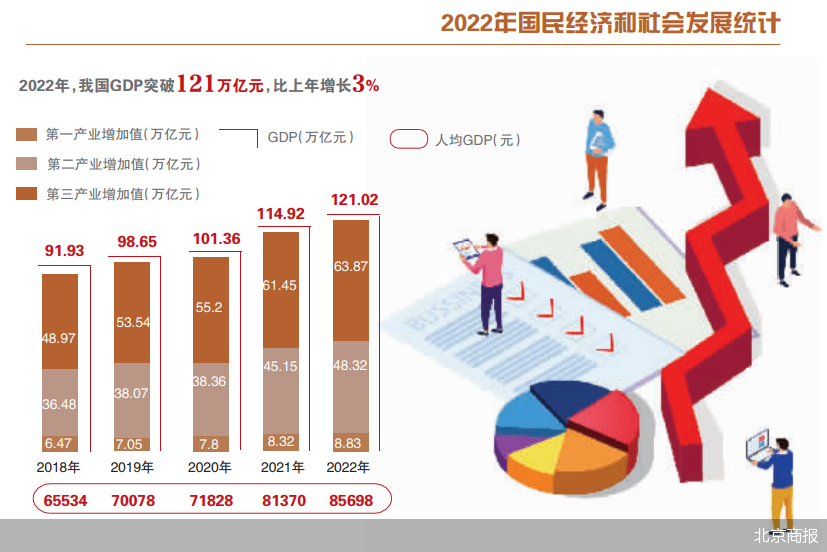 2月28日,国家统计局发布2022年国民经济和社会发展统计公报。经初步核算,2022年全年国内生产总值(GDP)达到1210207亿元,比上年增长3%。这是继2020年、2021年连续突破100万亿元、110万亿元之后,再次跃上新台阶。按年平均汇率折算,我国经济总量达18万亿美元,稳居世界第二位。