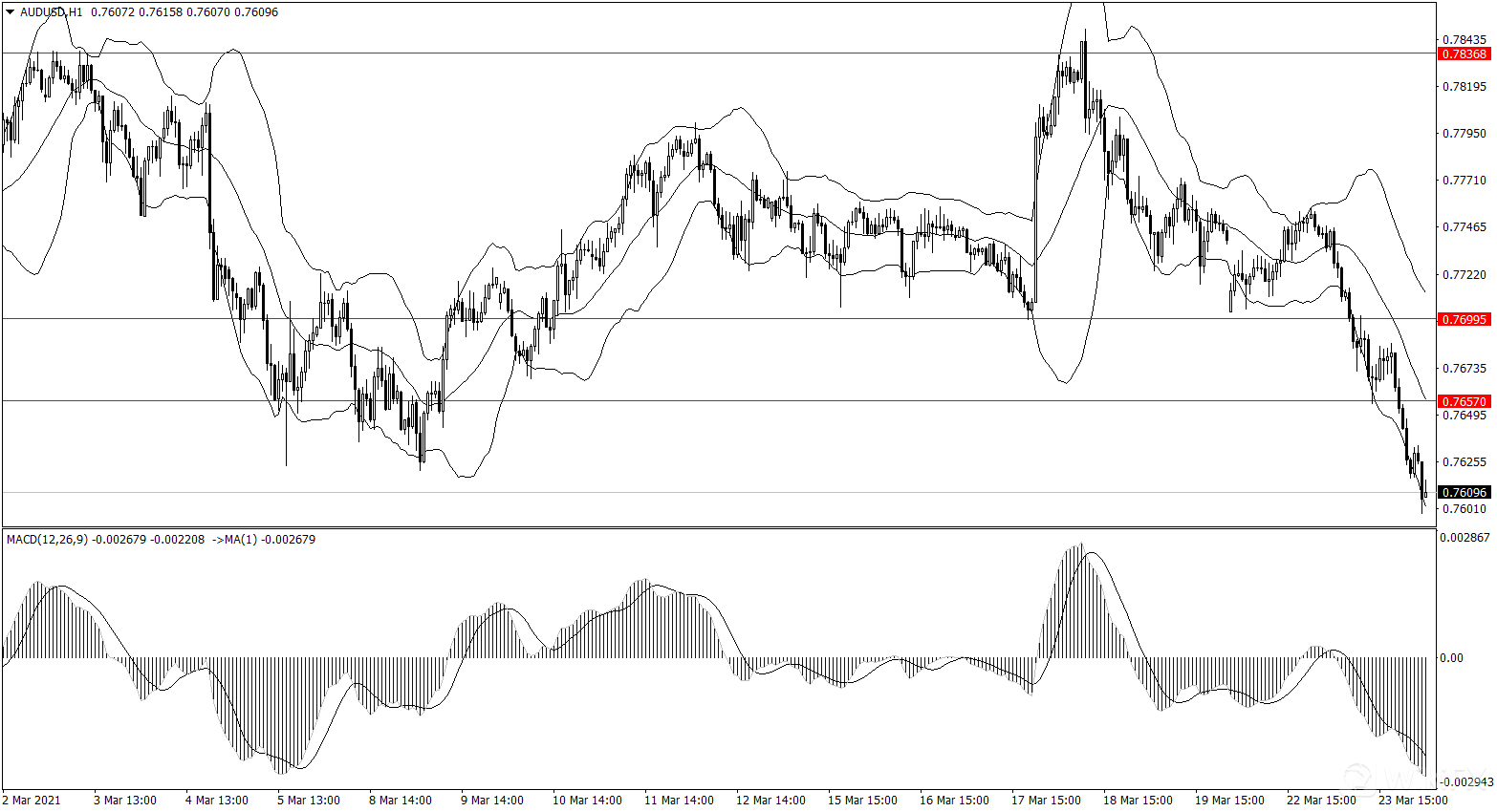 澳元在跌破0.769后加速回落,短线又跌破0.763,目前正在测试下方0.757/0.76附近支撑区域。指标看布林线开口加大,而MACD指标加速回落,目前似乎澳元下跌力度还是存在。交易策略逢高空为主,关注0.765/6区域的压力位。