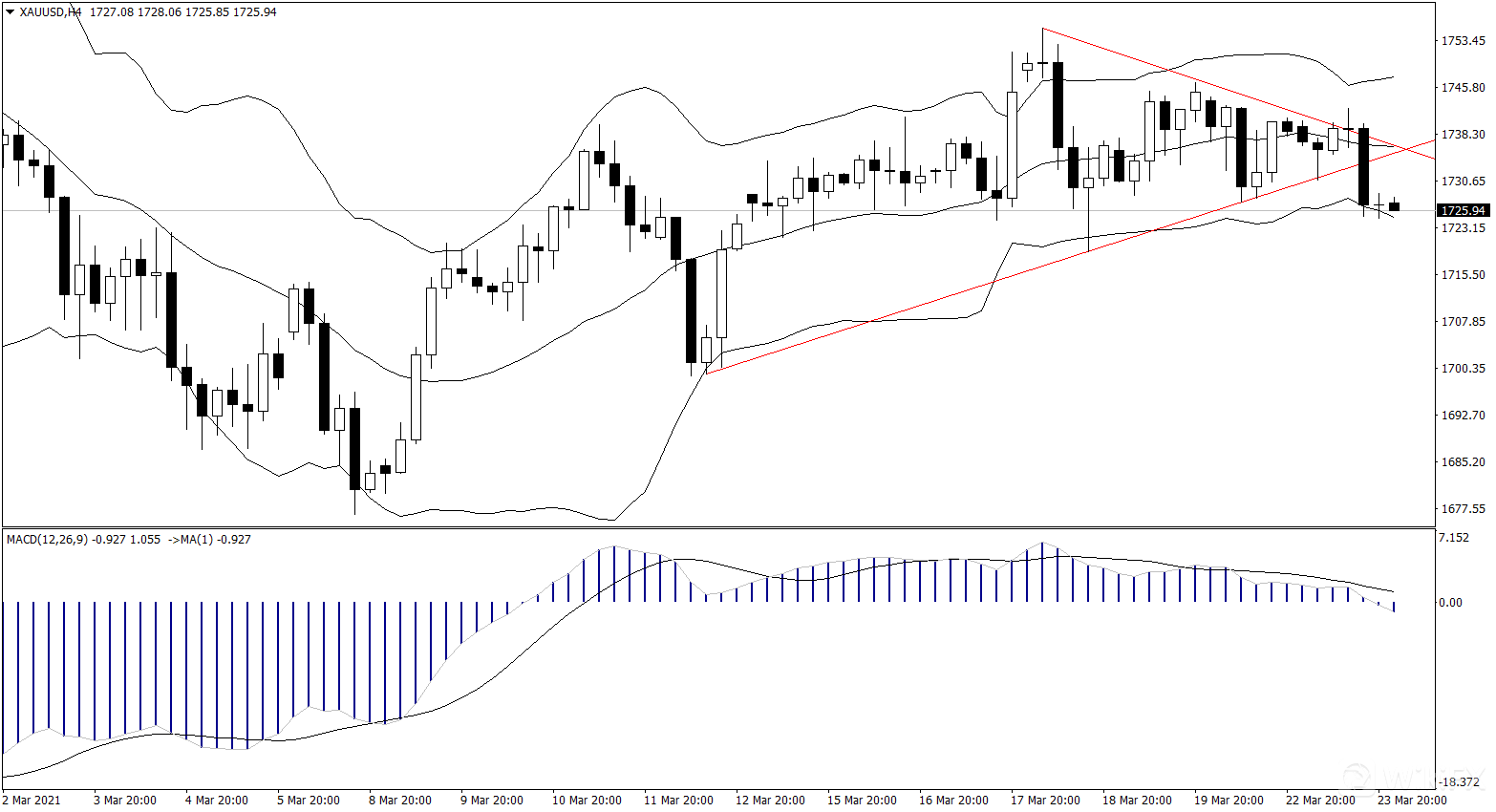 技术上,短线黄金跌破上升趋势线支撑,1732美元附近,形态不强,现在1730/2美元区域形成了关键压力,下方偏空,黄金短线第一支撑就是1718/1720美元区域。指标看布林线开口略微张大,而MACD回落至0轴位置,形势略偏空。交易策略逢高空为主,关注1730美元附近入场位置,升破压力位空头离场。