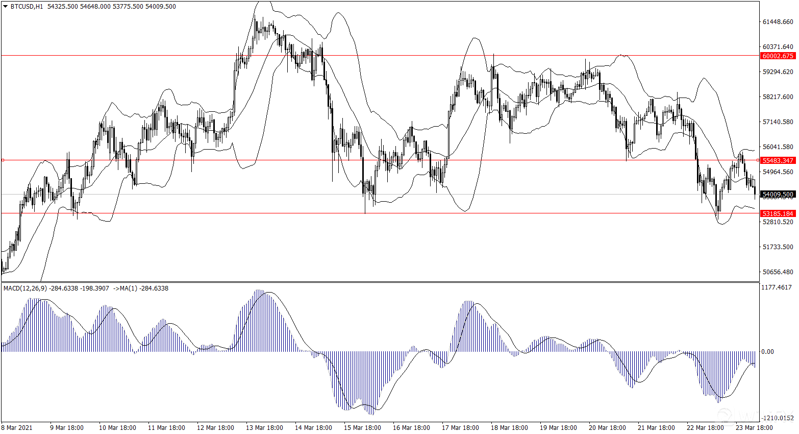 比特币短线正在测试53200美元附近支撑,如跌破比特币会加速下跌,上方压力是54700美元附近,55000美元。指标看布林线开口横盘,而MACD似乎在向下回落,形势上下跌动能还不能说消失。策略上逢高空为主,升破压力空头离场。