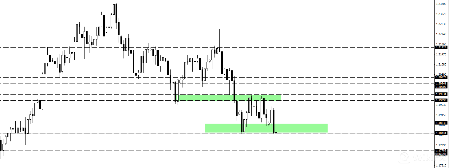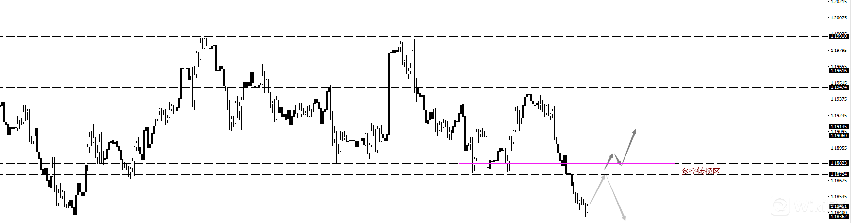 当前汇价处于前低所在支撑位,且有反弹迹象。日内重点关注汇价反弹至多空转换区的力度及其突破情况,若能有效上破多空转换区,并回踩多空分界区(1.1872-1.1882)不破,则应以多头思路对待;若在多空转换区承压,则应择机做空,下方支撑(1.1836)即是空单目标。