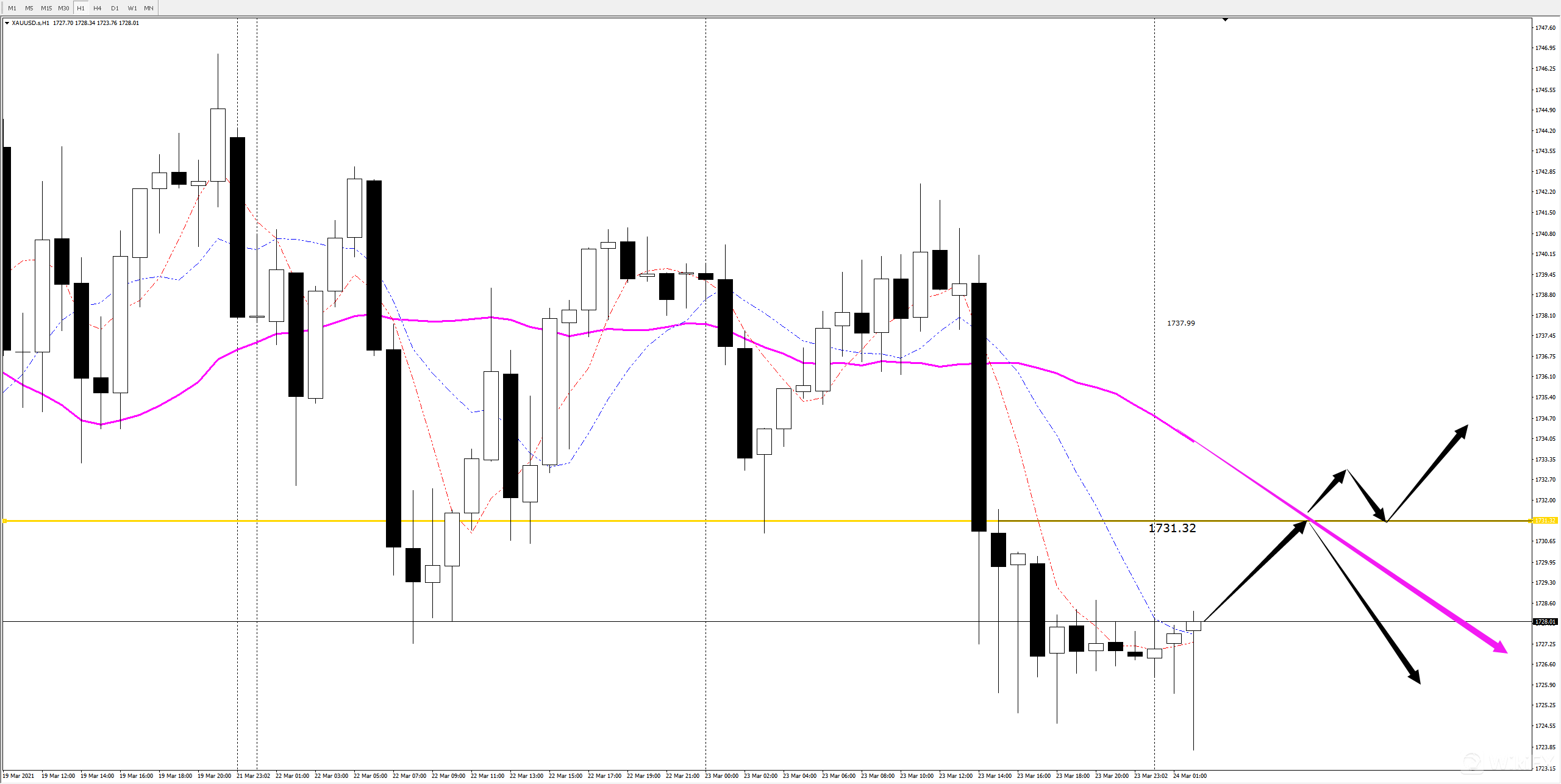 目前可以看到 ,黄金早盘开于小时图级别动静态多空分界下方不远处,并且跃跃欲试试图开启反弹,且根据动态多空分界(ma30)斜率可以看出,动静态多空分界将于欧盘前后进行汇合,对行情形成双重压力。