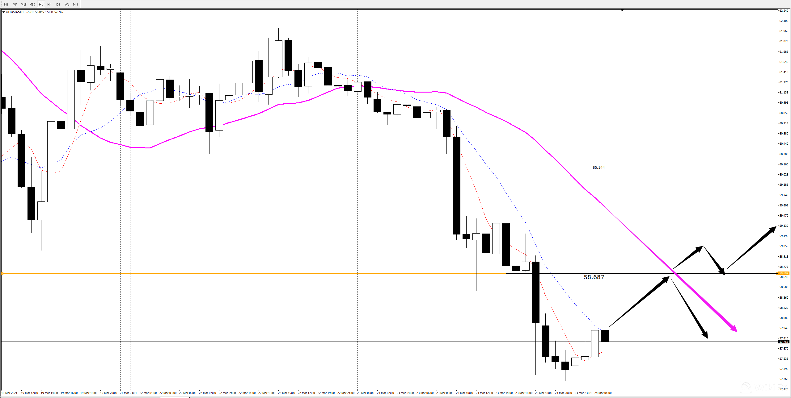技术面来看,昨日原油价格再次开启暴跌,且日k成功在动态多空分界(ma30)下方收阴,开启了日线级别在动态多空分界下方的这波空头趋势。从小时图来看,目前早盘原油开于动静态多空分界下方不远处,且动态多空分界(ma30)即将在欧盘后与静态多空分界(58.687)趋于重合,给行情形成双重压力。