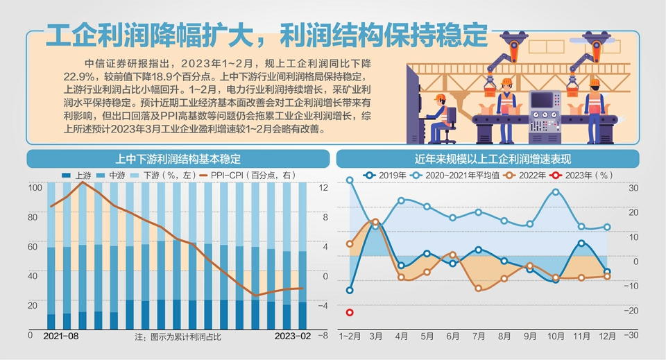 中信证券研报指出,2023年1~2月,规上工企利润同比下降22.9%,较前值下降18.9个百分点。上中下游行业间利润格局保持稳定,上游行业利润占比小幅回升。1~2月,电力行业利润持续增长,采矿业利润水平保持稳定。预计近期工业经济基本面改善会对工企利润增长带来有利影响,但出口回落及PPI高基数等问题仍会拖累工业企业利润增长,综上所述预计2023年3月工业企业盈利增速较1~2月会略有改善。