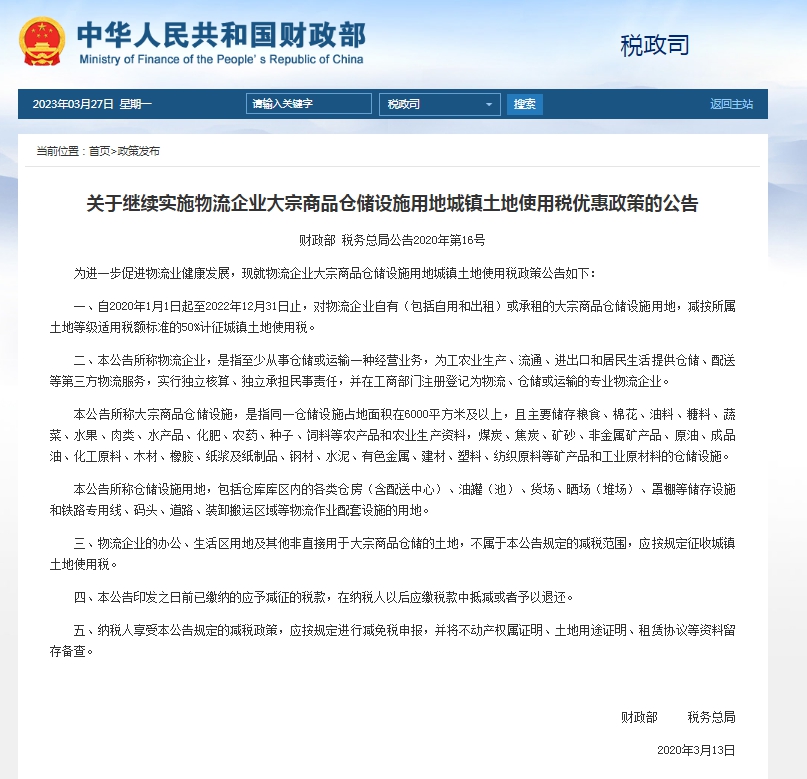 公告明确,自2020年1月1日起至2022年12月31日止,对物流企业自有(包括自用和出租)或承租的大宗商品仓储设施用地,减按所属土地等级适用税额标准的50%计征城镇土地使用税。