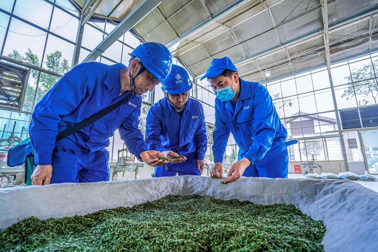 花开三月,春回大地,在位于四川省宜宾市翠屏区金秋湖畔的义兴农业发展有限公司的厂房里,数台机器齐声轰鸣,当天采摘的春茶鲜叶经过杀青、揉捻、制条、定型、烘干等一系列加工后,变成了可以流通市场的茶叶成品。