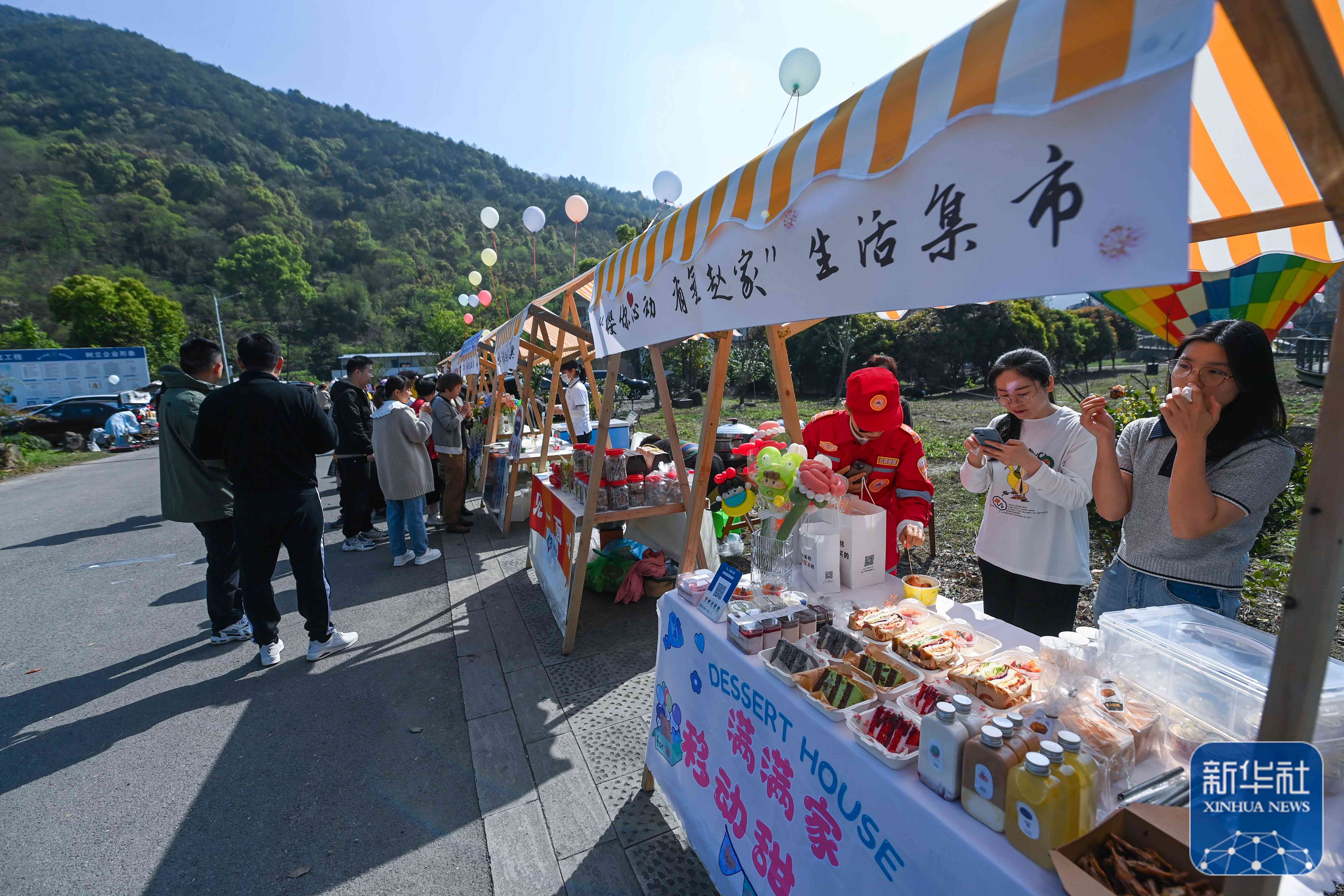 ↑4月8日,浙江省诸暨市赵家镇东溪村举行的春日山野市集设置免费摊位,推广优质农副产品以及网红美食,吸引游客前来了解选购。
