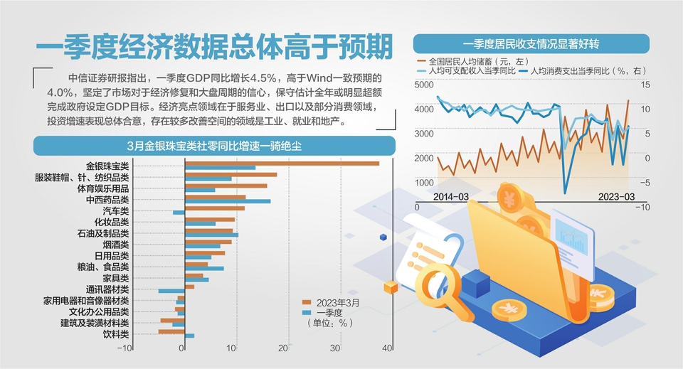 同时,随着居民消费需求逐步释放,升级类消费增长加快,基本生活类消费持续增长,支撑商品销售额稳定回升。一季度,商品零售额同比增长4.9%,上年四季度是下降1.7%。