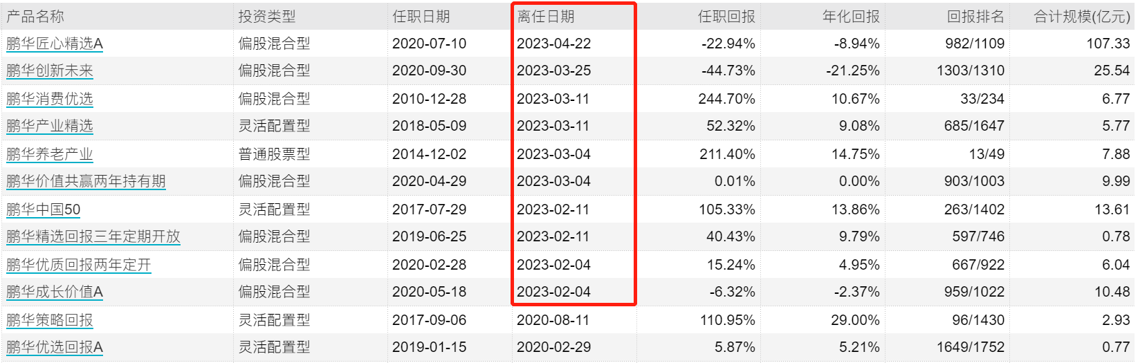 公告显示,自2月4日卸任鹏华优质回报和鹏华成长(206001)价值起,王宗合几乎以两只一批的节奏离任在管产品,截止2023年一季度末,在管产品数量便已只剩下鹏华匠心精选这一只“独苗”。而随着今日离任鹏华匠心精选,也宣告这这位曾经的业界顶流,已暂时离开基金管理的一线。