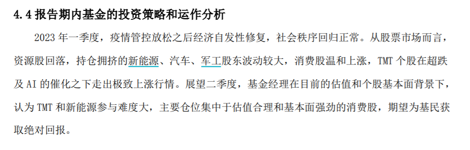 值得关注的是,4月21日,王宗合截止一季度末在管的唯一一只产品鹏华匠心精选刚刚披露一季报。在这份季报中,常被基金经理用来与投资者交流心得的“报告期内基金的投资策略和运作分析”栏目内容,显然已非王宗合撰写。