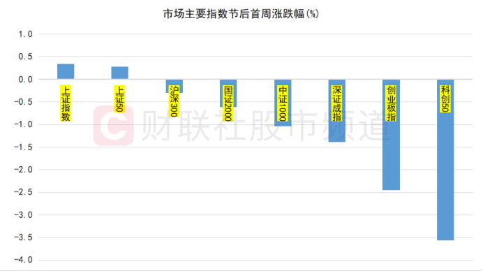 财联社(上海,编辑 梓隆)讯,节后首周,各大指数表现分化。其中,上证指数周线成功收涨,深证成指、创业板指则分别下跌近1.4%、2.5%。其余市场主要指数方面,上证50指数周涨近0.3%,国证2000、中证1000指数双双小幅收跌,而科创50指数表现不佳,累计下跌近3.6%。