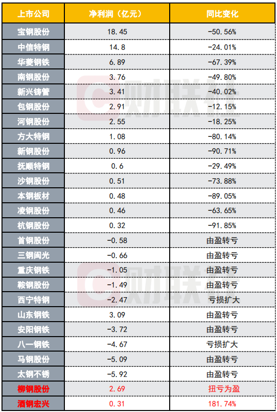 一季度仅柳钢股份(601003)(601003.SH)和酒钢宏兴(600307)(600307.SH)两家由于特殊原因,利润同比增加。其中酒钢宏兴公司人士表示,公司经营情况与同行基本一致,扣非净利润与去年相近,成本变化时间与其他公司相比或有一定差异。