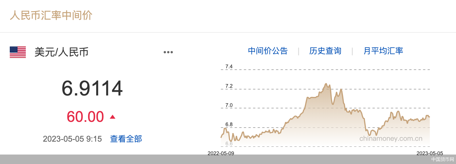 北京商报讯(记者 廖蒙)5月5日,央行授权中国外汇交易中心公布,2023年5月5日银行间外汇市场人民币汇率中间价为:1美元对人民币6.9114元,前一交易日中间价报6.9054元,单日调贬60基点。