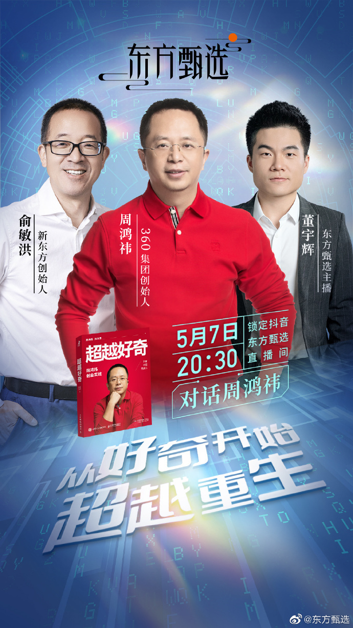 值得一提的是,5月5日晚,东方甄选放出海报称,将于5月7日晚对话360集团创始人周鸿祎。作为周鸿祎离婚后的抖音首秀,即将进行的这次对话吸引了许多粉丝关注。