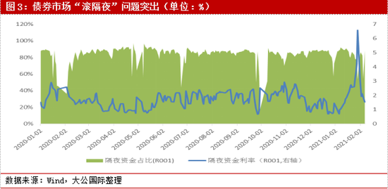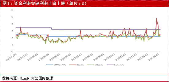 2021年伊始,资金市场出现较大波动,引起社会广泛关注。1月26日,人民银行货币政策委员会前委员马骏指出,股市、部分区域房地产市场的泡沫已经显现,提示存在潜在金融风险,引发市场对未来货币政策走向的大讨论。1月27~29日,资金市场波动达到顶峰,资金利率严重向上偏离政策利率:银行间市场的DR007接近利率走廊上限,R007突破利率走廊上限;交易所市场的GC001和GC007出现连续倒挂,GC001一度升至9.99%,凸显了市场流动性的紧张。