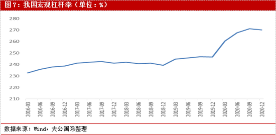 首先是稳定宏观杠杆率,防范金融风险累积。今年初易纲行长指出2021年货币政策“稳字当头”,需要处理好恢复增长和防范风险之间的关系。2020年末我国宏观杠杆率为270.1%,较2019年末增长23.6个百分点;2020年四个季度的增幅分别为13.9、7.2、3.6和-1.1个百分点,呈现逐季递减且第四季度去杠杆趋势。2020年我国广义货币供应量(M2)同比增长10.1%,社会融资规模存量同比增长13.3%;预计2021年M2和社融规模增速将会退坡,一方面是由于2020年高基数原因,另一方面是需要与反映潜在产出的名义经济增速基本匹配,未来需要注意退坡过程中一些区域可能暴露的信用风险。