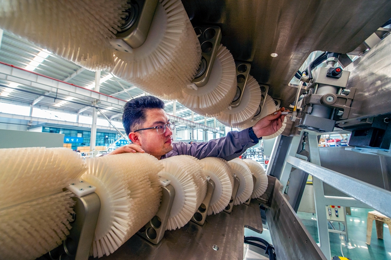 近年来,邮储银行山东淄博市分行立足智能制造产业链服务,组建智能制造重点产业工作小组,综合运用信用e贷、科创e贷、专精特新等专项贷款,“一户一策”为辖内40余家智能制造科技型企业提供金融支持。图为该行信贷支持的山东瑞邦智能装备股份有限公司员工正在进行设备调试。