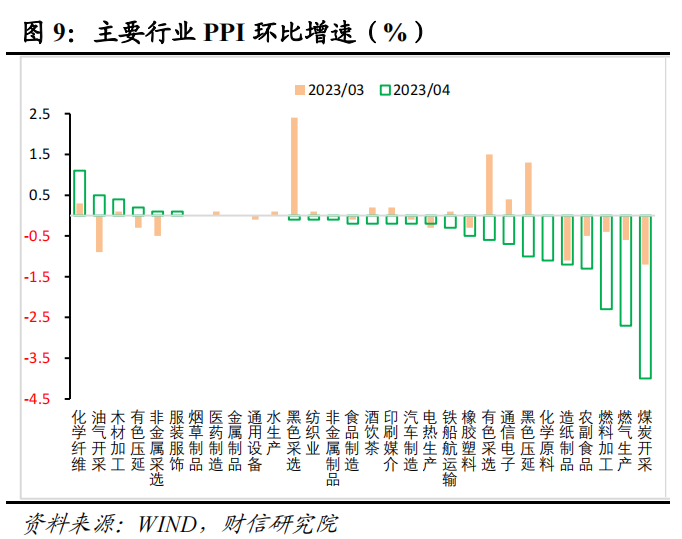 二、国内外需求偏弱、翘尾因素回落共致PPI降幅扩大,预计5月PPI增长-4.2%左右