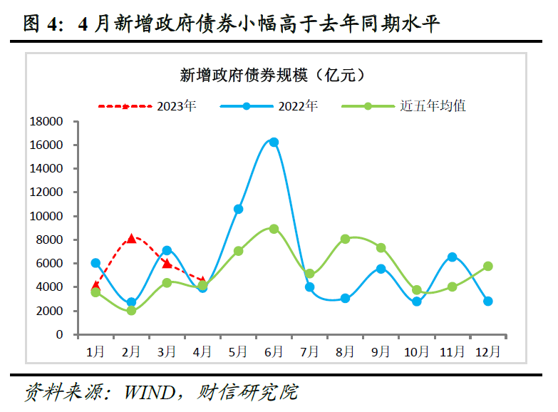 (一)表外融资、信贷和政府债券均对社融同比多增形成支撑。一是随着资管新规过渡期结束后非标压降任务告一段落,加上房地产企业等融资需求改善,以及去年同期基数偏低等因素影响,表外融资同比少减少2029亿元,对社融同比多增形成主要支撑(见图3)。其中,未贴现银行承兑汇票、信托贷款、委托贷款分别少减少1210亿元、多增734亿元和多增85亿元,前者为主要贡献力量,主要与部分表内票据融资转向表外,地产和基建融资需求回暖相关。二是受一季度人民币贷款(社融口径)新增超10万亿,透支了部分后续贷款需求和银行主动适度放缓信贷投放节奏,以及实体融资边际有所走弱等因素影响,4月新增人民币贷款(社融口径)4431亿元,仅为上月的一成左右,但去年同期疫情爆发导致有效融资需求不足、基数较低,支撑其同比仍多增815亿元(见图3)。三是同样受去年同期基数偏低的影响,本月政府债券发行量和净融资额虽环比趋于回落,但同比增加636亿元(见图3-4),也有利于社融同比多增,但2022年5-6月专项债集中发行,接下来政府债券基数将明显升高,或对社融形成扰动。此外,随着美联储加息步伐放缓、美国市场利率有所回落,本月外币贷款同比少减少441亿元(见图3),同比变化额连续两个月为正。