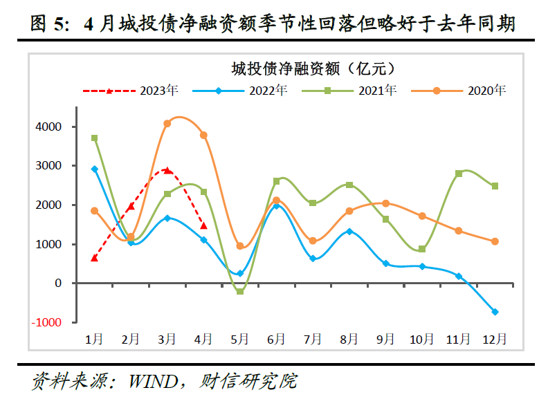 (二)企业债券、股权等直接融资对社融的拖累仍大。一是受城投偿还有息债务、借新还旧压力增加,基建融资需求增多,城投债券发行利率回落等因素影响,城投债净融资额连续3个月回暖,本月同比多增近400亿元(见图5),对企业债形成一定支撑;但近期银行竞相低价放贷挤占了部分信用债融资需求,加上企业盈利下降、投融资信心尚未完全恢复,4月企业债券净融资额总体同比减少809亿元(见图3),去年6月份以来的收缩态势仍未明显扭转。二是受资本市场波动加大、投资者对经济恢复力度存疑和海外银行业流动性风险事件扰动等因素影响,非金融企业股票融资同比减少173亿元(见图3),连续7个月同比减少,持续对社融形成负面冲击。