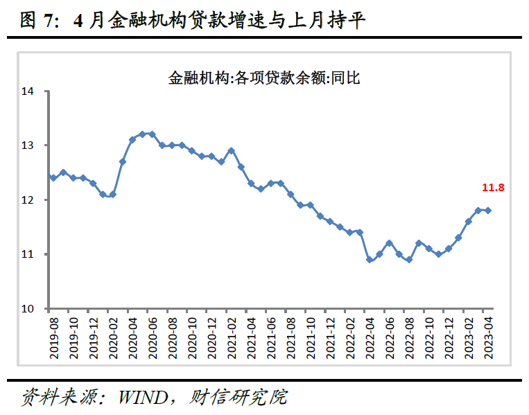 4月份金融机构新增人民币贷款7188亿元,低于市场一致预期和近五年历史同期均值较多,比上年同期多增649亿元(见图6);各项贷款余额增速为11.8%,与上月持平(见图7)。结构上,“企业强、居民弱”的分化特征依旧,企业部门仍是加杠杆主力,尤其是企业中长贷连续9个月保持同比高增;居民部门新增贷款转负,居民中长贷拖累显著,反映出地产需求端恢复偏弱,居民需求不足矛盾凸显。