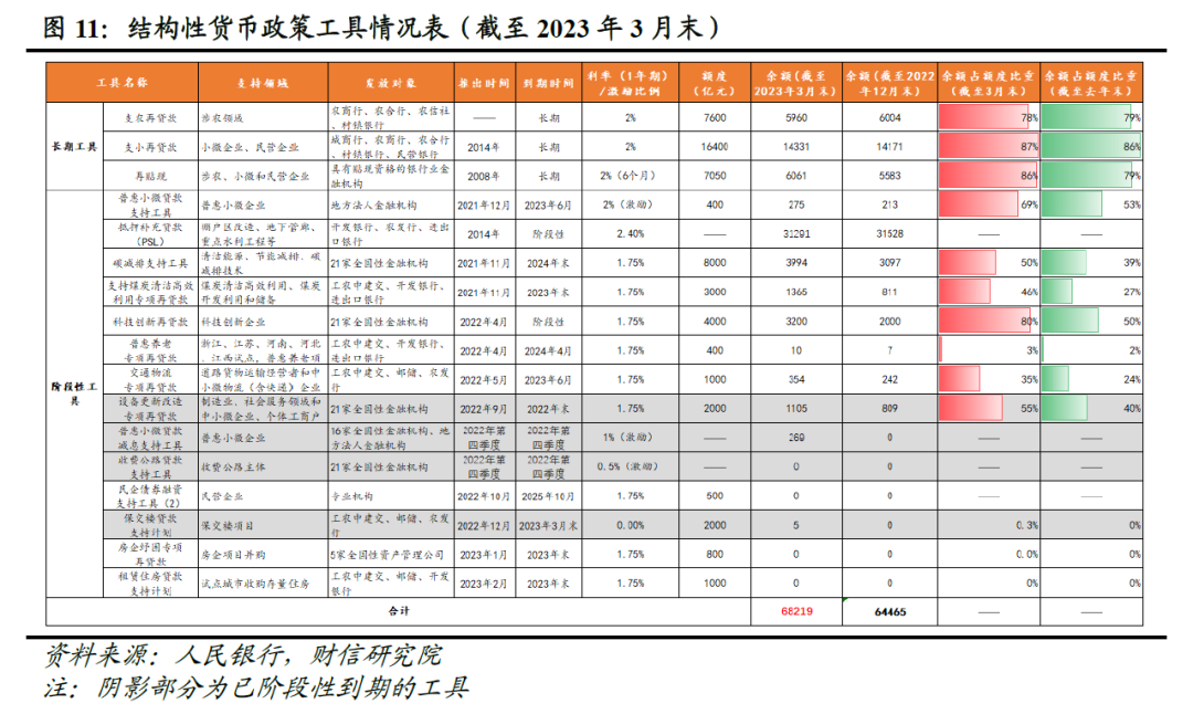 三是结构性政策方面,预计继续聚焦稳住地产融资,加大对科技、绿色等领域支持力度。一方面,4月份我国房地产市场销售边际明显走弱,地产投资意愿持续疲软,均表明继续加大对房地产的融资支持必要性仍强,这也是支持经济持续好转绕不开的坎。今年1、2月份央行先后新创设房企纾困专项再贷款和租赁住房贷款支持计划两项结构性货币政策工具支持地产恢复(见图11),预计未来金融对房地产的支持力度或不减。另一方面,为持续推动经济高质量发展,预计结构性货币政策将继续发力重点加大对科技创新、绿色低碳等领域的金融支持力度,但其他阶段性特征比较明显的结构性工具将及时退出,做到有进有退(见图11),预计制造业、绿色和普惠小微等领域贷款增速有望继续保持高增。