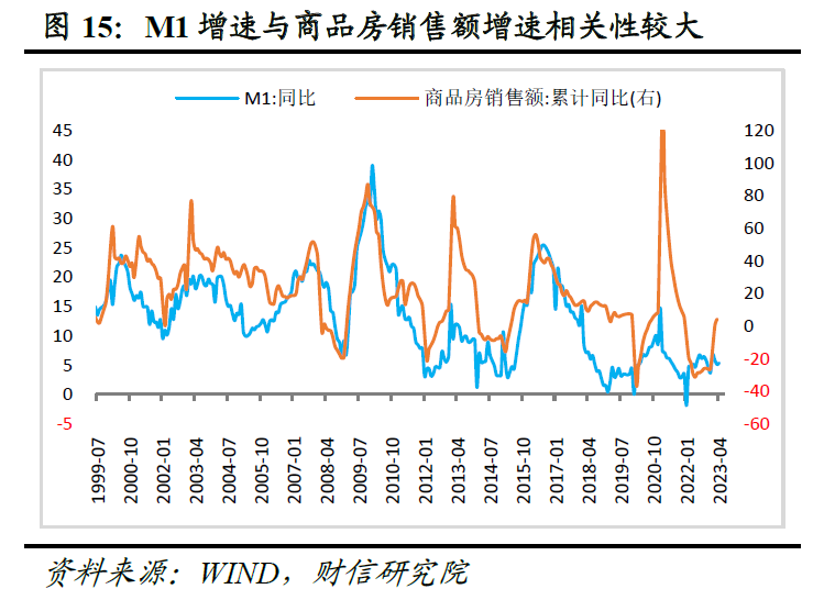 4月末M1同比增长5.3%,增速较上月提高0.2个百分点(见图14)。其中,占M1的比重超过80%的单位活期存款,其增速由3月的4.1%提高至4月的4.3%,是主要支撑因素,同期M0增速较上月回落0.3个百分点至10.7%,不利于M1增速回升。单位活期存款增速较上月回升或主要与经济活动恢复,尤其是以服务业为主的企业现金流改善相关。如1-4月份国内服务业PMI连续四个月处于50%的荣枯线上方,显示服务业活动持续恢复,相关企业现金流或明显改善,五一假期全国国内旅游出游人次同比增长70.8%,旅游收入同比增长128.9%,也反映出服务消费恢复势头强劲。往后看,经济持续恢复有利于M1增速回升,但房地产消费恢复偏慢、加上PPI降幅扩大和企业去库存拖累工业企业盈利延续负增长,未来M1增速回升幅度和速度仍待观察,如历史上房地产市场景气度与M1增速走势较为一致(见图15)。