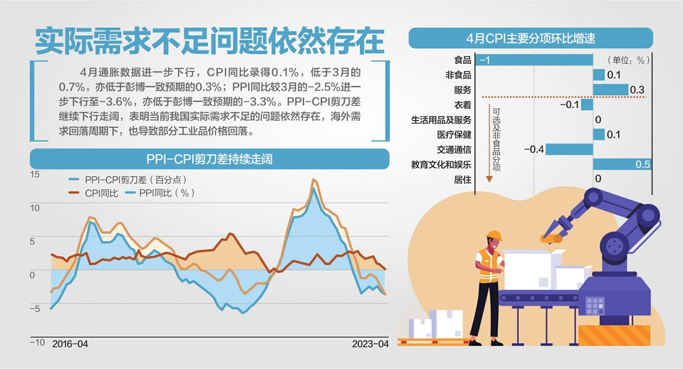 4月,PPI环比下降0.5%,同比下降3.6%,降幅比3月扩大1.1个百分点。