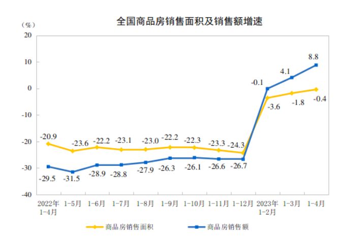 1—4月份,商品房销售面积37636万平方米,同比下降0.4%,其中住宅销售面积增长2.7%。商品房销售额39750亿元,增长8.8%,其中住宅销售额增长11.8%。