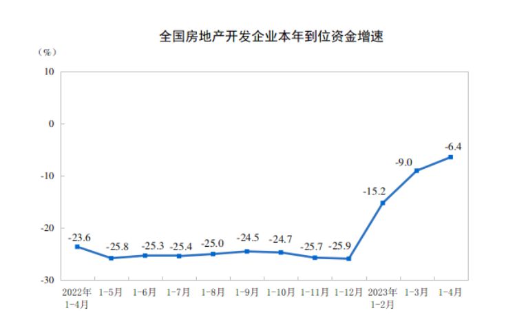 1—4月份,房地产开发企业房屋施工面积771271万平方米,同比下降5.6%。其中,住宅施工面积542968万平方米,下降5.9%。房屋新开工面积31220万平方米,下降21.2%。其中,住宅新开工面积22900万平方米,下降20.6%。房屋竣工面积23678万平方米,增长18.8%。其中,住宅竣工面积17396万平方米,增长19.2%。