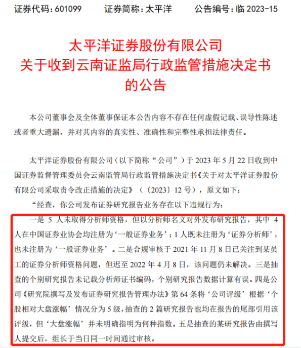 5月23日,太平洋(601099)证券公告称,公司于22日收到云南证监局行政监管措施决定书,公司被采取责令改正措施。