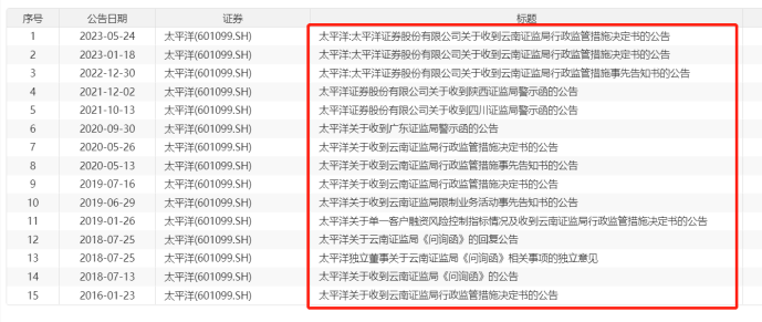 东财Choice数据统计显示,自2016年至今,太平洋证券涉地方证监局处罚或问询函多达15份,涉及到的监管机构包括云南、陕西、四川、广东等四地证监局。此外,证监会于2018年5月22日也曾对公司下发过警示函。