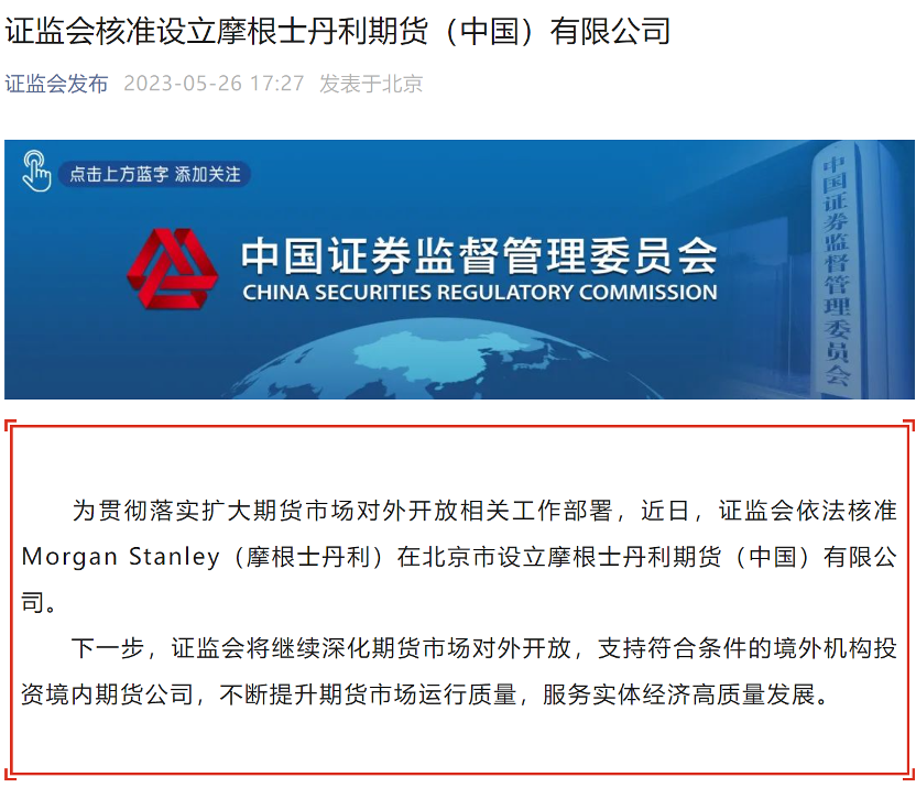 5月26日,证监会宣布,为贯彻落实扩大期货市场对外开放相关工作部署,近日,依法核准Morgan Stanley(摩根士丹利)在北京市设立摩根士丹利期货(中国)有限公司。