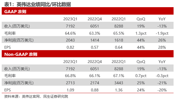 2023年5月25日,据英伟达官网、钛媒体数据,英伟达2023Q1实现营收71.92亿美元,同比减少13%,连续第二次减幅超10%,但高于公司指引区间、大幅优于分析师平均预期的65.2亿美元;非美国通用会计准则下净利润为27.13亿美元,同比下降21%,环比增长25%;毛利率为66.8%;每股收益1.09美元,高于分析师平均预期为0.92美元,同比下降20%,环比增长24%。由于业绩高于市场预期,加之英伟达预计二季度销售额110亿美元,同比增长64%。财报发布后的盘后交易中,英伟达股价大涨24.63%。