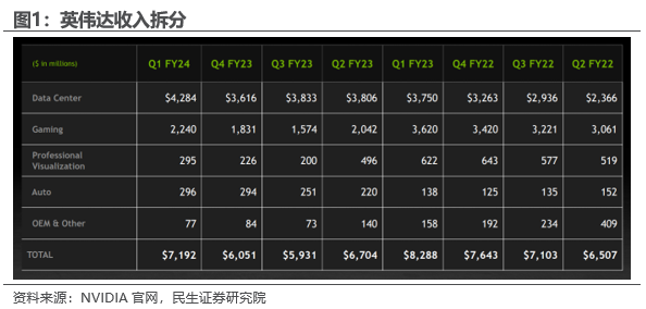 大模型AI快速发展带动数据中心业务创历史新高。英伟达2023Q1业绩超预期核心原因是数据中心业务营收达到创纪录的42.84亿美元,环比增长18%,同比增长14%。英伟达数据中心业务主要是云计算基础设施和算力芯片等,作为目前大模型训练、推理的关键算力资源,海内外各大科技巨头对算力的需求正在持续提升。据钛媒体,英伟达CFO克雷斯表示,目前市场对生成式 AI 芯片的需求超出先前评估,由于 AI 芯片需求仍保持强劲增长,英伟达给出乐观业绩预期。