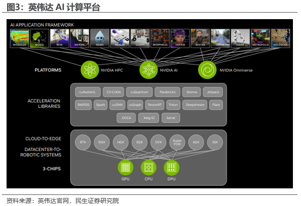 公司AI计算平台边界不断扩展。英伟达推出了NVIDIA Spectrum?-4,这是世界上首个400Gbps端到端的网络平台,为大规模的数据中心基础设施提供了极高的性能和强大的安全性。英伟达对其AI平台进行了重大更新,包括企业级软件和新的NVIDIA AI Accelerated程序,以提升AI应用的性能和可靠性。英伟达推出NVIDIA OVX?,这是一个专门的、可扩展的服务器参考设计,用于在Omniverse中创建工业级数字孪生;推出NVIDIA Clara? Holoscan MGX,这是一个专门为医疗设备行业设计的平台,用于开发和部署实时AI应用。