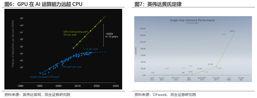 GPU接替CPU成为AI时代的底层算力。据沐曦集成电路,GPU的特点是并行处理能力强、计算能效比高,并且有很大的存储带宽。某些应用,在人工智能模型训练与推理、高性能计算等,往往是大数据流应用,这时,用GPGPU解决这类问题,就比CPU效率更高,它对于用传统语言编写的、软件形式的计算有较好的支持,具有高度的灵活性。英伟达创始人黄仁勋曾提出“摩尔定律已死”、黄氏定律(GPU性能一年翻一倍)等著名观点,坚持GPU芯片的战略。