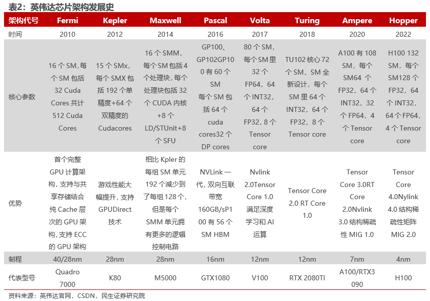 复盘历史,英伟达GPU一直是性能与功耗的最优解。据Twisted Meadows,英伟达每代芯片架构的 SM 都有较大设计改动,甚至有时连名字都改了(SMX、SMM),这是影响性能细节的关键;尽可能多的 SM 数和 Cache 容量是性能提升的核心要素,但是受限于芯片面积,厂商无法简单增加这两者。反而每隔几年的制程工艺提升总会带来 SM 和 Cache 的增加;SM 内的 FP32 数量曾在 Kepler 架构上被设计得很高,但是缓存不够大导致每个 FP32 能用的缓存很小,性能根本发挥不出来,所以 Nvidia 后来又逐渐调降了 SM 内 FP32 的数量;架构变迁中,英伟达在芯片面积有限、功耗/散热有限的情况下,不断调整各种组件的配置比例,凭借制程工艺的提升,不断寻找性能与功耗的最优解。